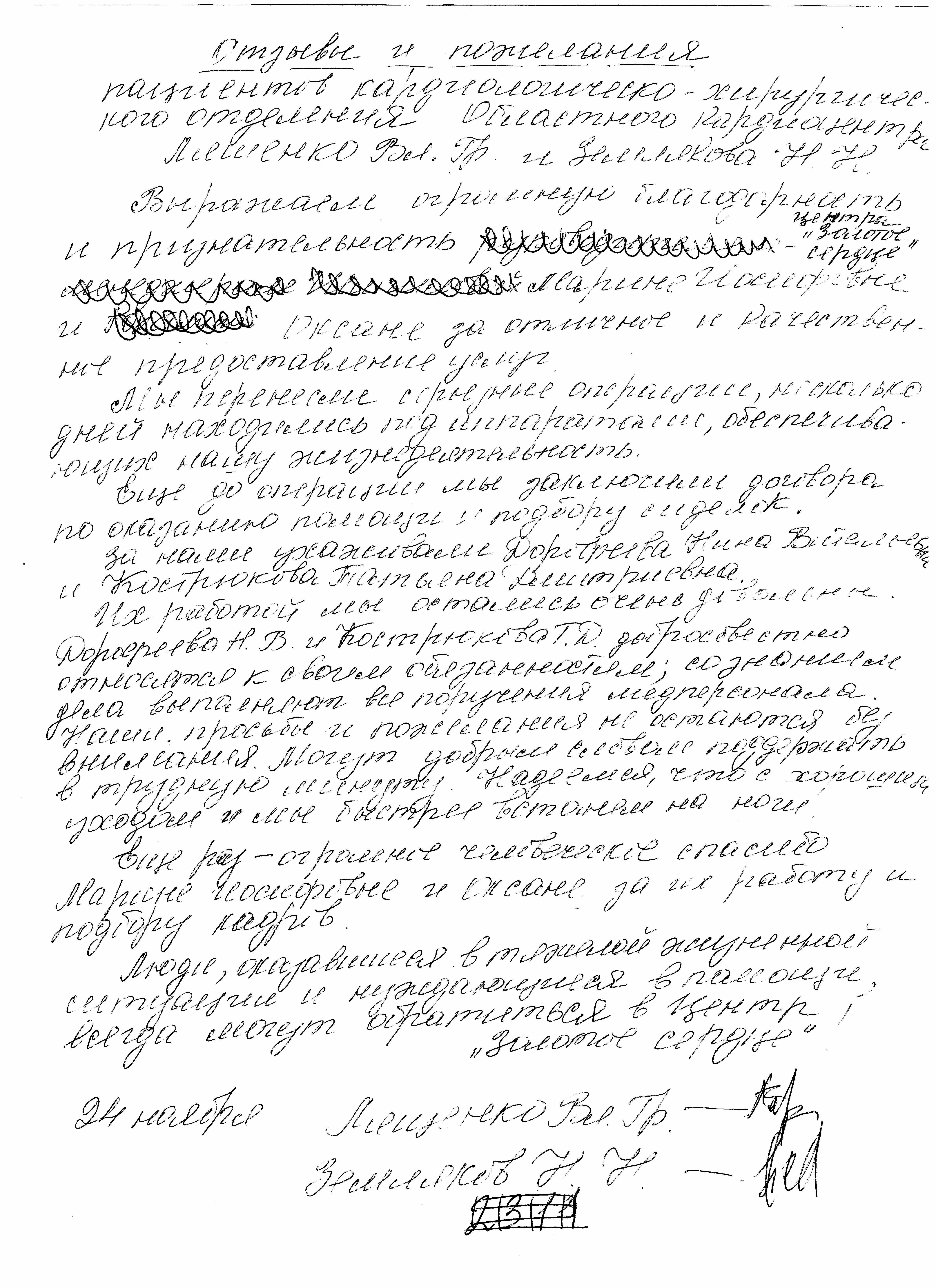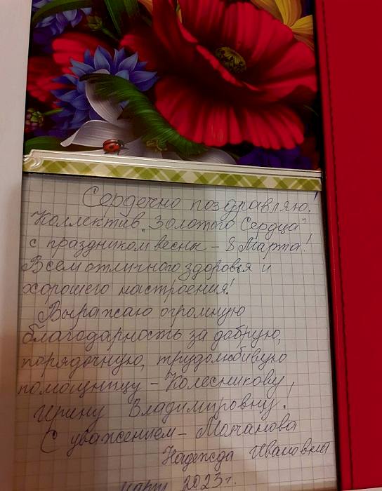 Спасибо за то, что вы выделили ко мне работать круглосуточных сиделок Шемякину Антониду Николаевну и Кострюкову Татьяну Дмитриевну. Это отличные сиделки, они замечательно справляются со своими обязанностями. Они внимательные добродушные женщины. Всегда приходят и работают с улыбкой. Эти «девочки» (я их так называю) с большим, открытым сердцем. Они для меня стали родными людьми, с которыми мне хочется жить и общаться. Я их всегда жду с нетерпением. У них всегда улыбка на лице, и такое настроение передаётся мне. Это Вы, Марина Иосифовна, создали такой дружный, спаянный коллектив, который работает с Вами много лет. Хочу Пинап всех вас с нашим женским праздником 8 Марта. И пожелать вам всем оставаться такими же отзывчивыми и внимательными к нам, больным.